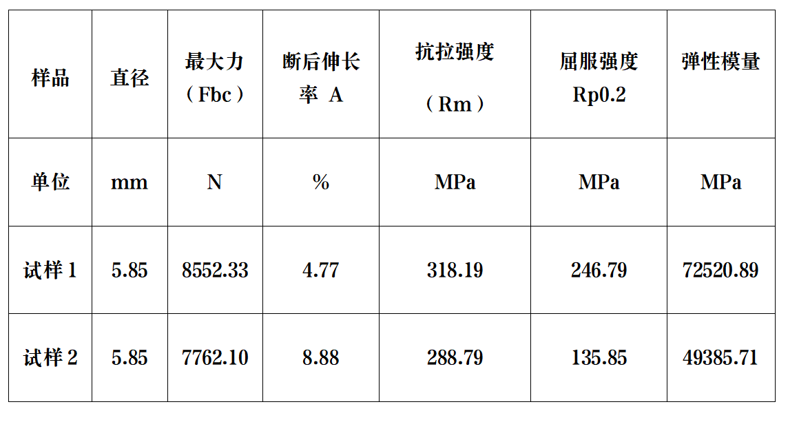 试验要求:求取最大力、断后伸长率、抗拉强度、屈服强度、弹性模量