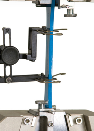 6、装置试样:正确装置试片: 量测记录试件尺寸,计算截面积。试片先夹于上夹具后,电脑启动下降或上升按钮,使中联板上下夹具提升到适当装夹位置夹持试片。