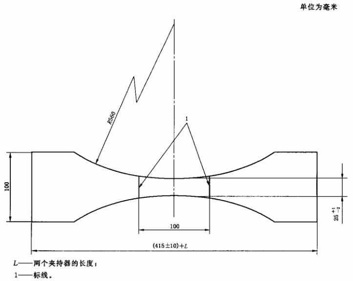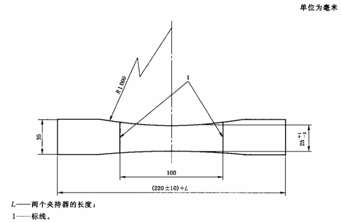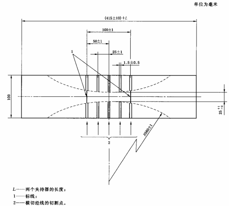 在试样上与试样纵向中心线垂直,与试样中心等距地划两条标线,标距为100mm(见图1、图2、图3和图4)。