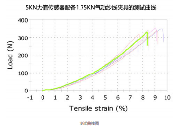本测试麻豆激情视频使用了KZ-5KN单柱麻豆免费性爱视频 ,配备5KN静态力传感器, 1.75KN气动细绳和纱线夹具。试样的标距长度 设为250mm,横梁的移动速度为250mm/min,使用全闭环伺服采集软件,采样间隔 50ms。为了检查打滑,麻豆激情视频在丝的每一端粘贴了一个标记,并检测带条以检测标记和夹具之间没有相对移动。第二个试验中,用2KN的气动芳族聚酰胺纱线和纱线夹具换下1.75KN的纱线夹具。