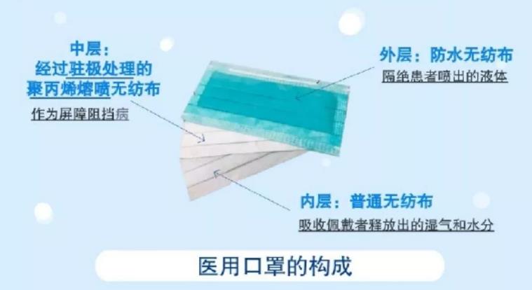 常见的医用口罩,主要由三层无纺布组成。内层是普通无纺布,主要用于吸收佩戴者释放出的湿气和水分;外层是做了防水处理的无纺布,主要用于隔绝患者喷出的液体;核心中间的过滤层用的是经过驻极处理的聚丙烯熔喷无纺布,作为屏障阻挡病菌。