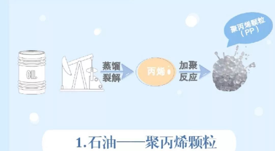 石油经过蒸馏裂解得到丙烯,丙烯加聚反应形成的聚合物就是聚丙烯(PP)颗粒。