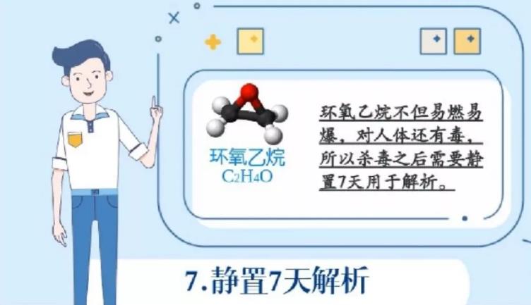 环氧乙烷易燃易爆,对人体有毒,因此杀毒后需要静置7天用于解析,残留量低于要求值,才能包装出厂,供给医护人员使用。