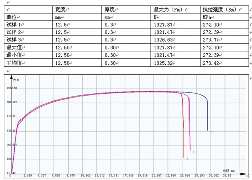 给客户是一家集印铁制罐于一体的金属包装生产企。马口铁又名镀锡铁,是电镀锡薄钢板的俗称,英文缩写为SPTE,是指两面镀有商业纯锡的冷轧低碳薄钢板或钢带。锡主要起防止腐蚀与生锈的作用。它将钢的强度和成型性与锡的耐蚀性、锡焊性和美观的外表结合于一种材料之中,具有耐腐蚀、无毒、强度高、延展性好的特性。马口铁包装由于其良好的密封性、保藏性、避光性、坚固性和特有的金属装饰魅力,决定了其在包装容器业内具有广泛的涵盖面,是国际上通用的包装品种。随着马口铁各种CC材料、DR材料、镀铬铁的不断丰富,促进了包装制品及技术发展,马口铁包装到处充满创新。因其抗氧化性强,且款式多样、印刷精美,马口铁包装容器深受广大客户喜爱,广泛应用于食品包装、医药品包装、日用品包装、仪器仪表包装、工业品包装等方面。此次该客户委托我司做了马口铁的麻豆免费性爱视频拉伸试验,试验得出相关数据及参数如下: