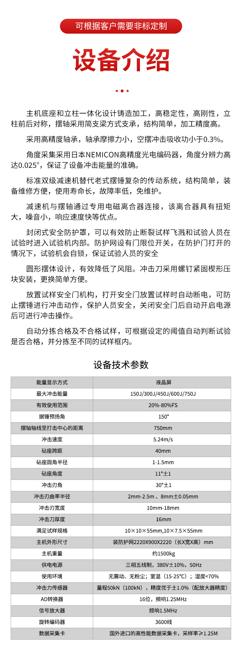 1.主机机架与底座一体化设计、整体铸造加工,克服了机身机座分体连接处的薄弱环节,整体刚性和稳定性大大提高,提高了试验的稳定性。机体吸收能量小,测量结果更接近于试样真实吸收功。更适合高能量冲击;