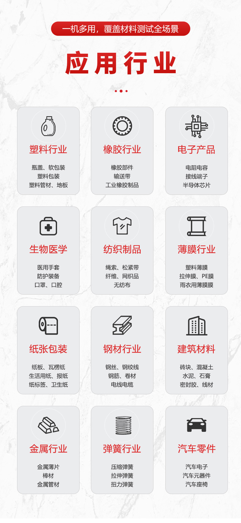 主要用于对材料进行拉伸、撕裂、剥离、抗压、弯曲、抗剪切、三点抗折、四点抗折等各类物理性测试。
